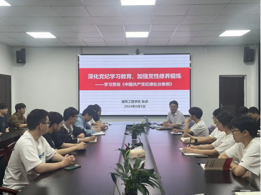 党委书记张虎在建工北楼310会议室讲授了题为《深化党纪学习教育,加强党性修养锻炼》的党纪学习教育专题党课。学院各学生党支部党员代表参加了学习。