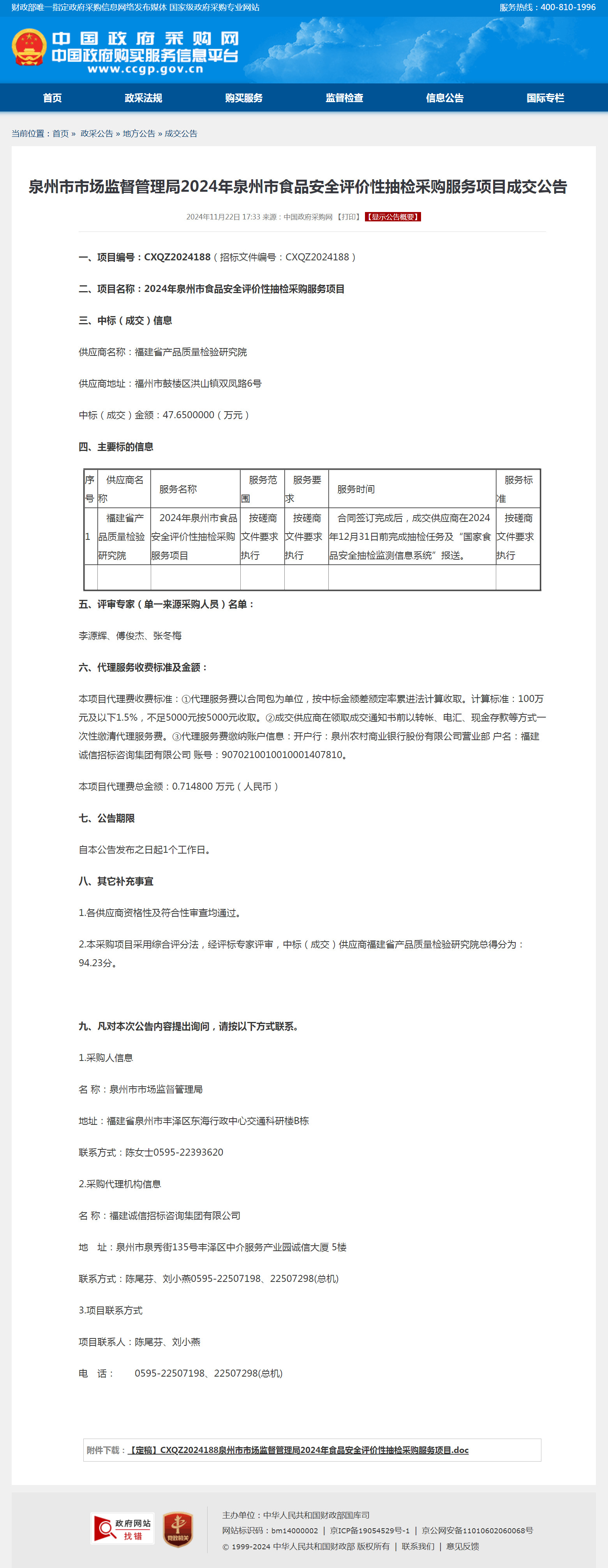 2024年泉州市食品安全评价性抽检采购服务项目成交公告