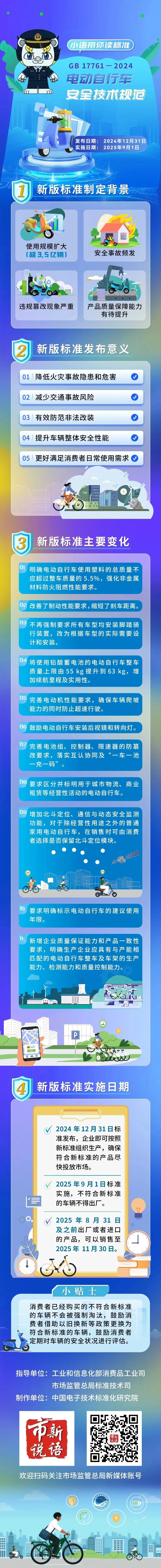 由工业和信息化部、香港六合彩会同公安部、应急管理部、国家消防救援局组织修订的强制性国家标准GB17761-2024《电动自行车安全技术规范》已于2024年12月31日正式发布,并将于2025年9月1日实施。新规针对电动自行车的整车标志、整车安全、机械安全、电气安全、防火阻燃、塑料占比、北斗定位功能、通信与动态安全监测、防篡改、使用说明书、企业质量保证能力和产品一致性等技术要求都有了一定的变化,一图带你快速了解↓↓↓