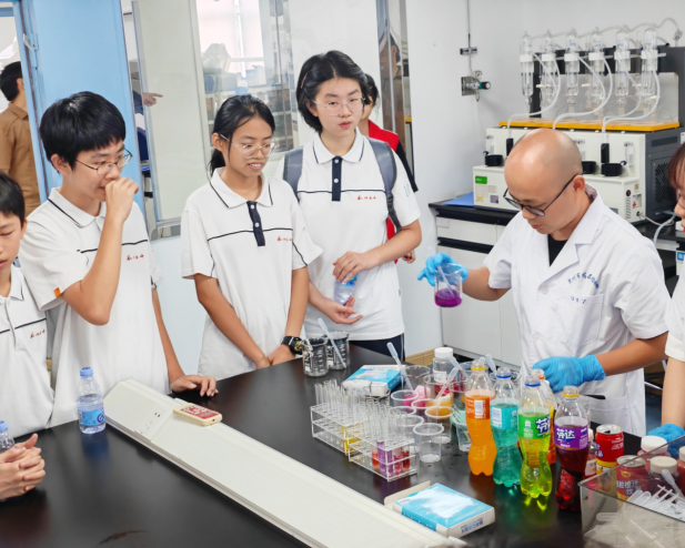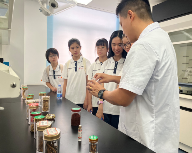 在实验室里,专业人员通过演示用吸色片快速鉴别饮料中的人工色素和天然色素,帮助学生树立科学健康的饮食安全理念;通过中药材展示对比,教导学生初步掌握从外形、纹路、气味等方面辨别三七、红花等常见药材,在观、识、嗅、触中感受中医药文化的博大精深;通过“库洛米”“线条小狗”等卡通图案增加教学趣味性;设计石灰水“变脸”及焰色反应动手实验,让学生通过亲身体验掌握气体成分检测的原理和反应相关科学知识。