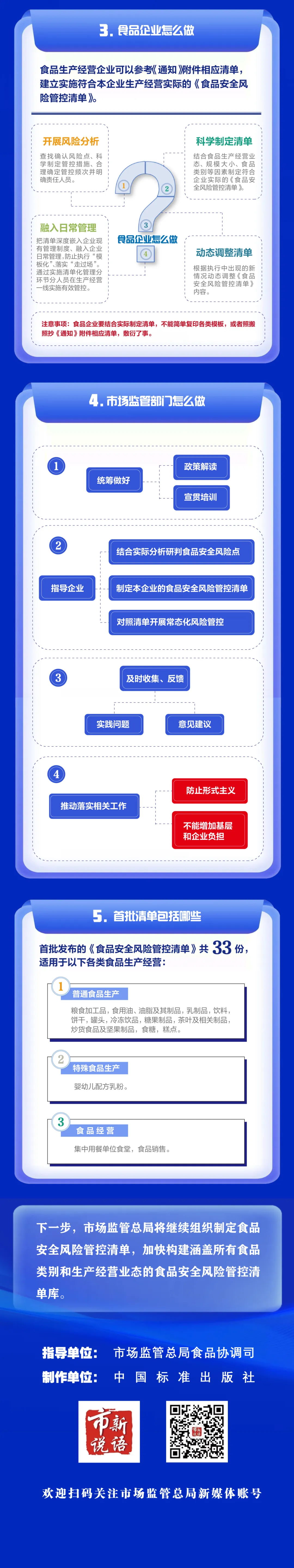 此次发布的食品安全风险管控清单为食品企业精准防控风险提供了参考和指南,企业可以结合经营业态、规模大小、食品类别等开展食品安全风险分析,查找确认风险点,科学制定管控措施,合理确定管控频次,明确责任人员,建立符合企业实际的《食品安全风险管控清单》,把食品安全风险管理要求融入现有管理制度、嵌入日常管理,严防严管严控食品安全风险,切实保证食品安全。