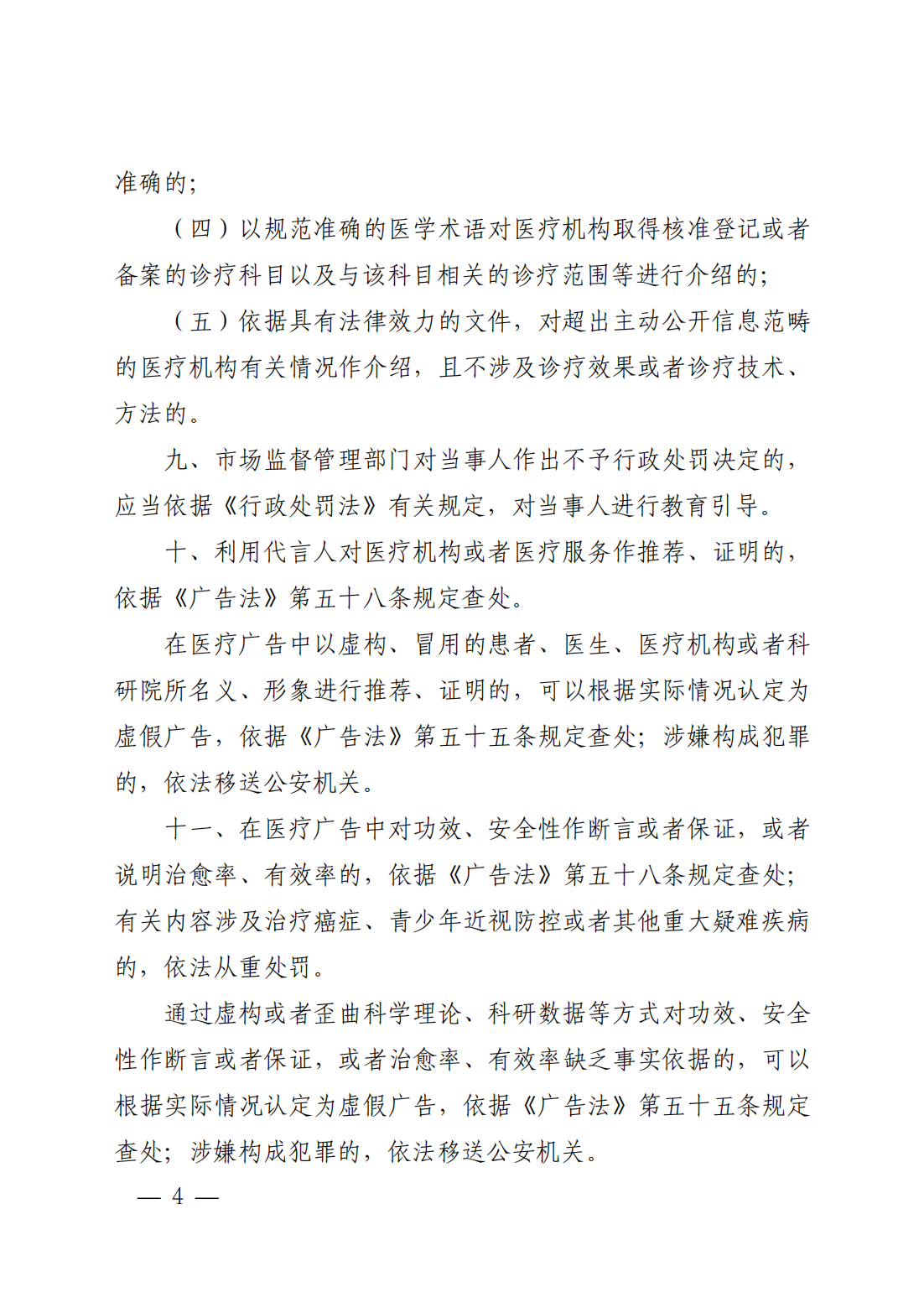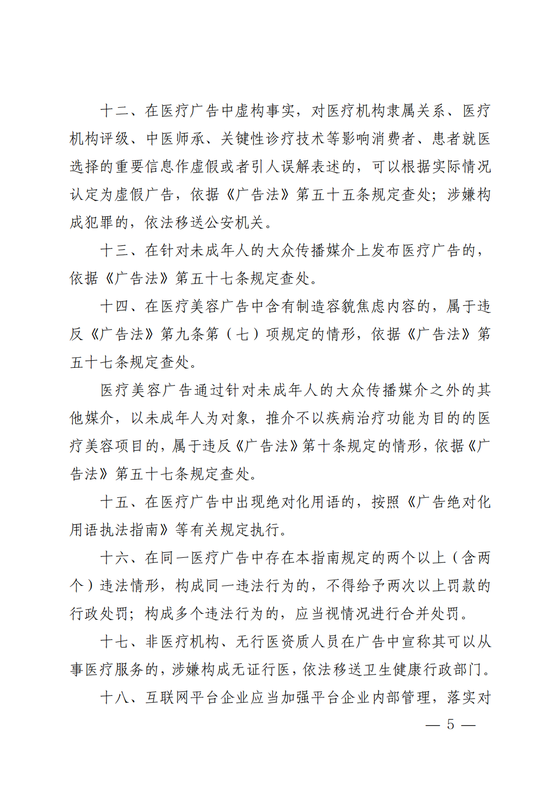 《指南》规定了市场监管部门在查处医疗广告时应当遵循的原则;细化了对违法医疗广告依法不予处罚以及从轻、减轻、从重处罚的具体情形;对制造容貌焦虑、针对未成年人的医疗美容广告以及含有绝对化用语的医疗广告等,明确了法律适用依据;重申了医疗广告违法情形有关行刑衔接等内容,规定了互联网平台企业的责任义务。